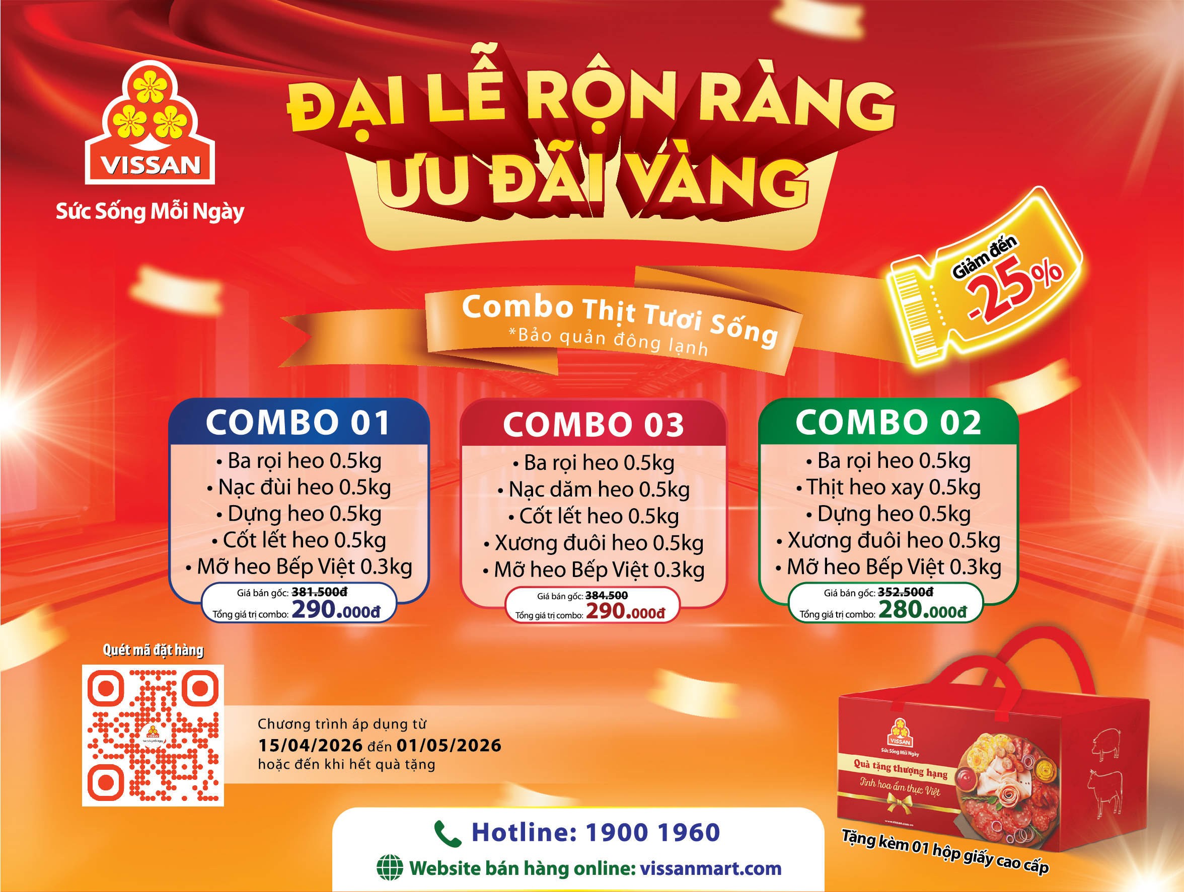 Nhằm đáp ứng nhu cầu mua sắm thực phẩm của người tiêu dùng trong dịp lễ, Công ty Cổ phần Việt Nam Kỹ nghệ Súc sản (VISSAN) triển khai chương trình khuyến mãi “Đại lễ rộn ràng – Ưu đãi vàng”, áp dụng cho các sản phẩm thực phẩm tươi sống với nhiều ưu đãi thiết thực.