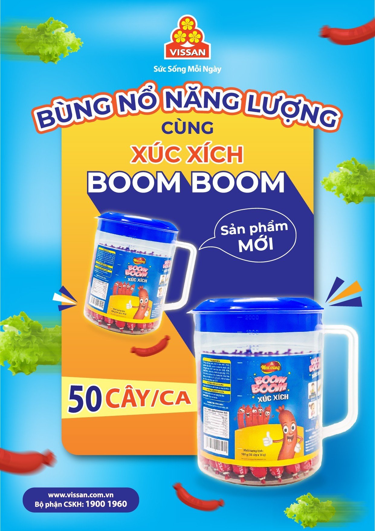 Để phù hợp với nhu cầu đa dạng của các nhóm đối tượng khách hàng, từ trẻ nhỏ đến người lớn, công ty VISSAN đã cải tiến, thêm quy cách đóng gói mới cho sản phẩm Xúc xích Boom Boom, với quy cách đóng gói 50 cây xúc xích đựng vừa vặn trong ca nhựa xinh xắn sẽ mang đến trải nghiệm thú vị và độc đáo cho khách hàng.