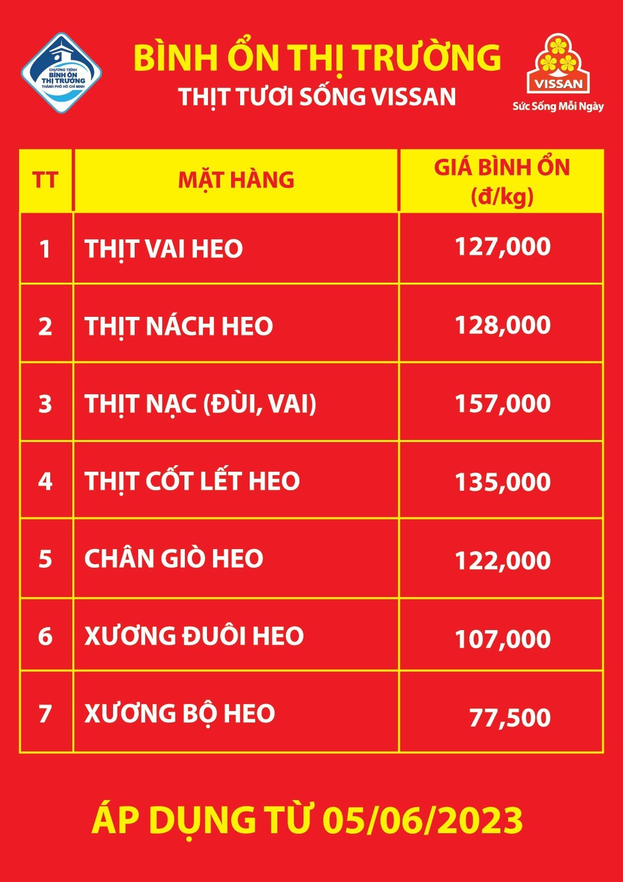 Từ ngày 05/06/2023 Công ty VISSAN điều chỉnh giá 07 mặt hàng thịt heo VietGAP bình ổn thị trường, áp dụng tại tất cả các cửa hàng, siêu thị và điểm bán của Công ty VISSAN, nội dung cụ thể như sau: