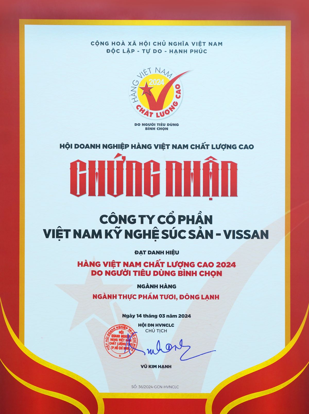 Ngày 14/03/2024, công ty VISSAN vinh dự được Hội Doanh nghiệp Hàng Việt Nam chất lượng cao (HVNCLC) trao tặng danh hiệu Doanh nghiệp Hàng Việt Nam Chất Lượng Cao năm 2024 do người tiêu dùng bình chọn trong 28 năm liên tục.